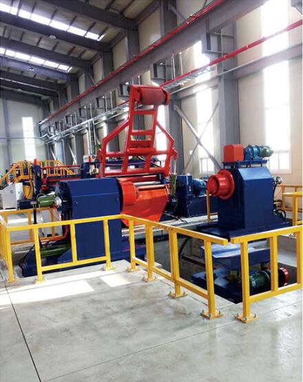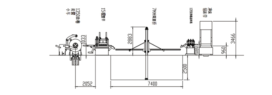 本設(shè)備是將鋼卷板通過整平后、定尺沖壓落料、橫剪廢料的方式、把鋼板加工成客戶需要尺寸的專用自動(dòng)剪切設(shè)備。該生產(chǎn)線的主要設(shè)備由液壓上料小車、開卷機(jī)、接料鏟頭、整平主機(jī)、渡橋、NC偏擺定尺送料機(jī)、沖壓設(shè)備、圓片輸送帶等機(jī)構(gòu)構(gòu)成。